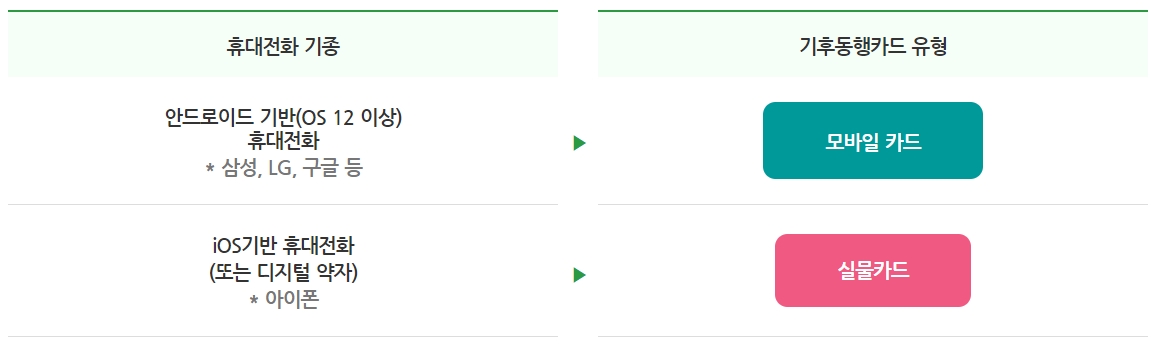 ② 사용범위를 확인 후 본인의 휴대전화 기종이 안드로이드 기반인지 아이폰(IOS) 기반인지에 따라 모바일카드와 실물카드로 나눠져서 사용이 가능한데 아이폰(IOS) 기반은 아직 지원이 불가능하여 실물카드를 구입하여 사용하여야 합니다.