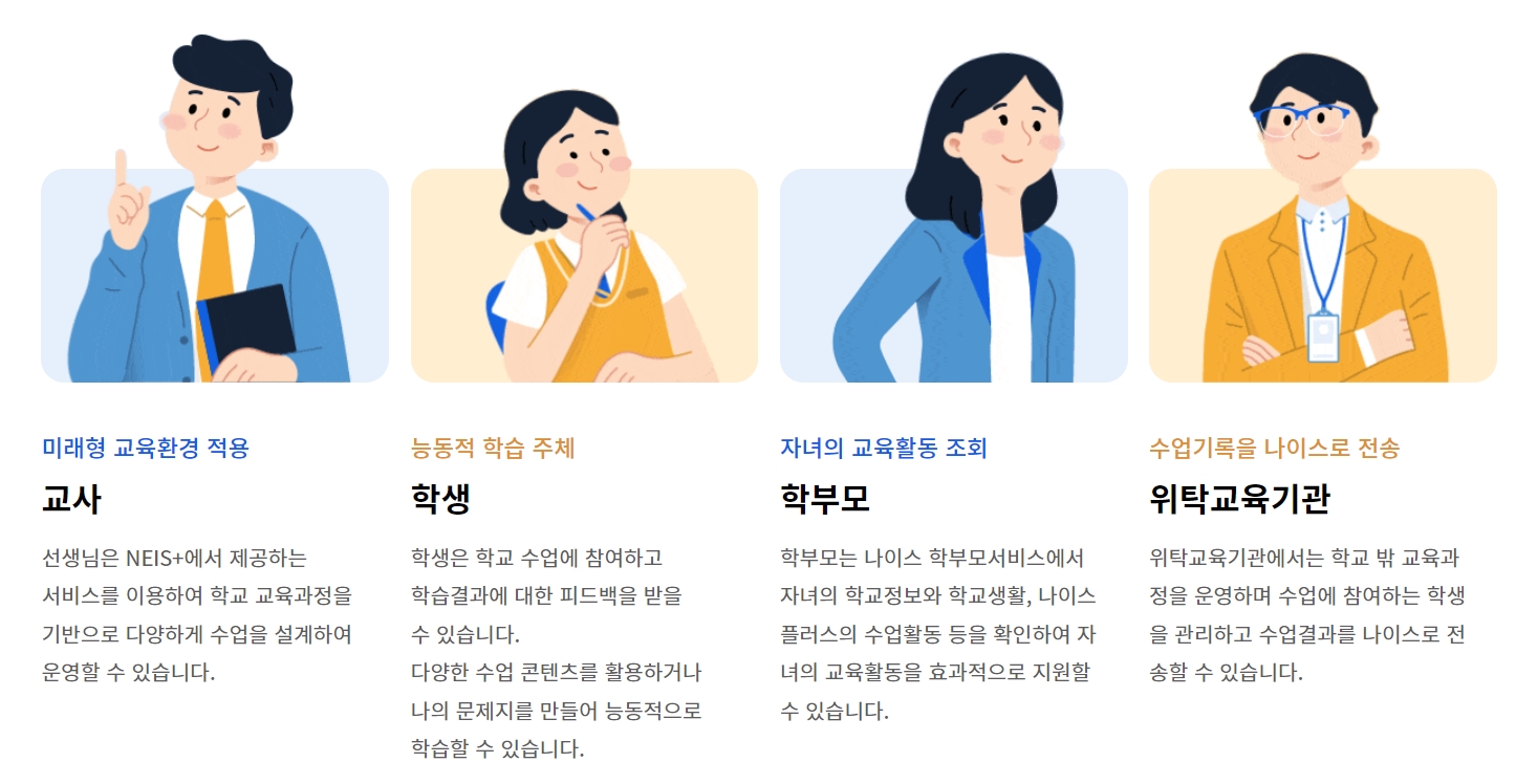 나이스 플러스는 교사,학생,학부모,위탁교육기관 등 다방면에서 지원이 되는데 지원내용은 아래와 같습니다.