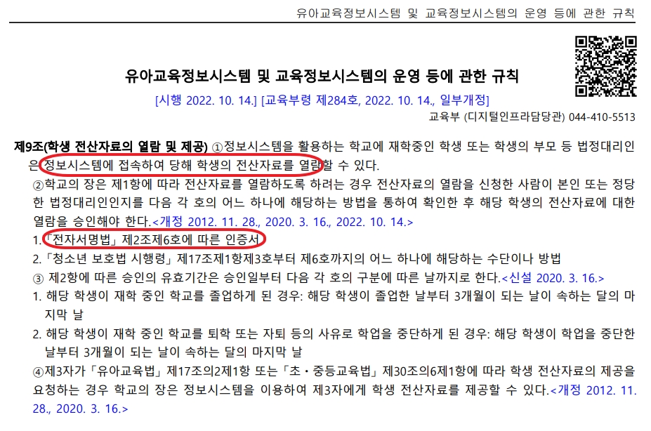 ※ 위에 얘기한 관련 법령을 알아보니 「유아교육정보시스템 및 교육정보시스템의 운영 등에 대한 규칙」 제9조에서 확인 가능하며 아래 첨부합니다.
