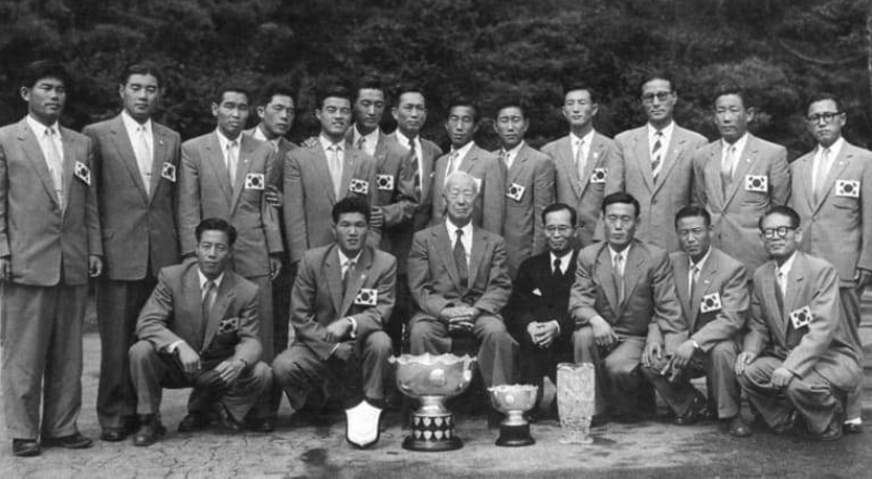 1956년 한국 국가대표팀이 우승하고 이상만 대통령과 함께