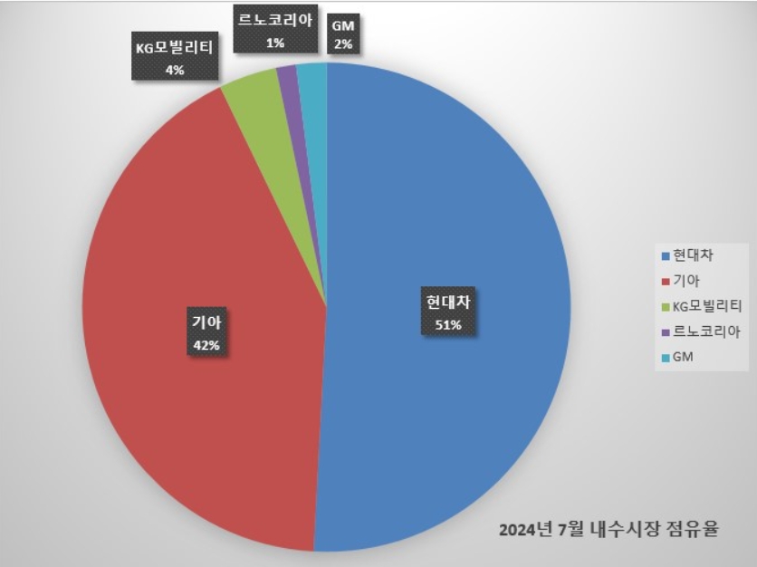위 표를 보면 국산차 내수시장 점유율을 보면 현대차가 51%로 1위, 기아자동차가 이어 2위, 3위는 KG 모빌리티, 4위는 GM, 마지막 5위는 르노코리아인 걸 알 수 있습니다.