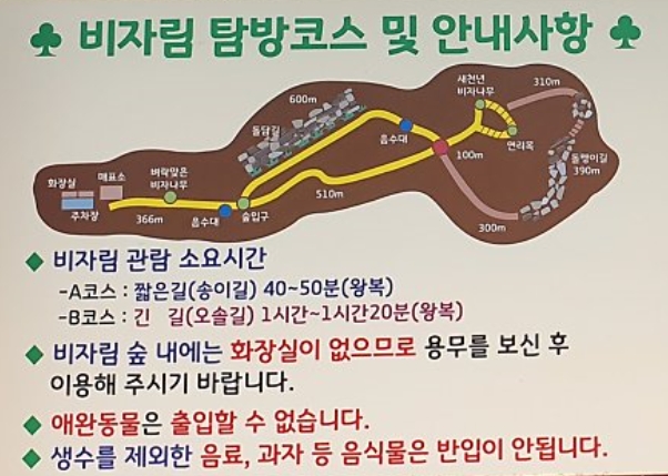 - 비자림 안에는 화장실이 없으므로 입장 전 입구에 화장실을 꼭 갔다가 입장해야 함