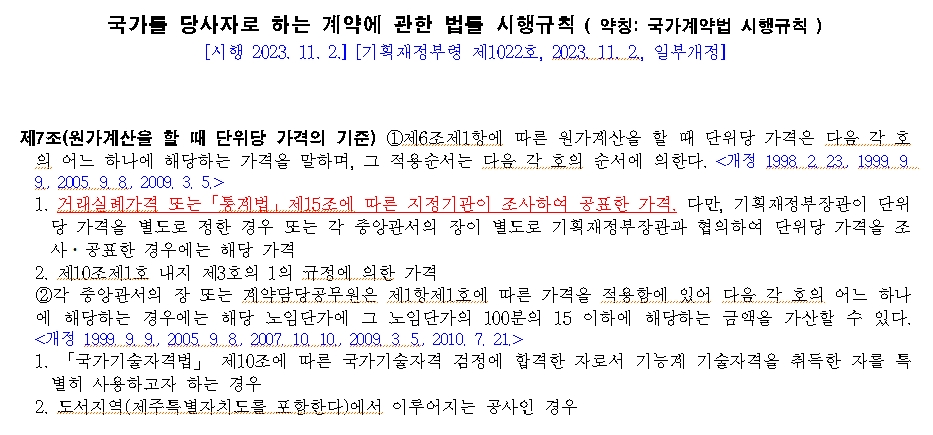 시중에 사용하는 노임단가는 법령에 의거 적용이 됩니다. 국가계약법과 지방계약법에 각각 명시가 되어 있습니다. 먼저, 국가계약법에 시행규칙 제7조에 나와있는 법령을 보면 아래와 같습니다.